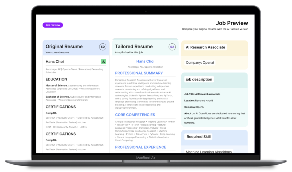 Our AI rewrites your resume to fit the role.